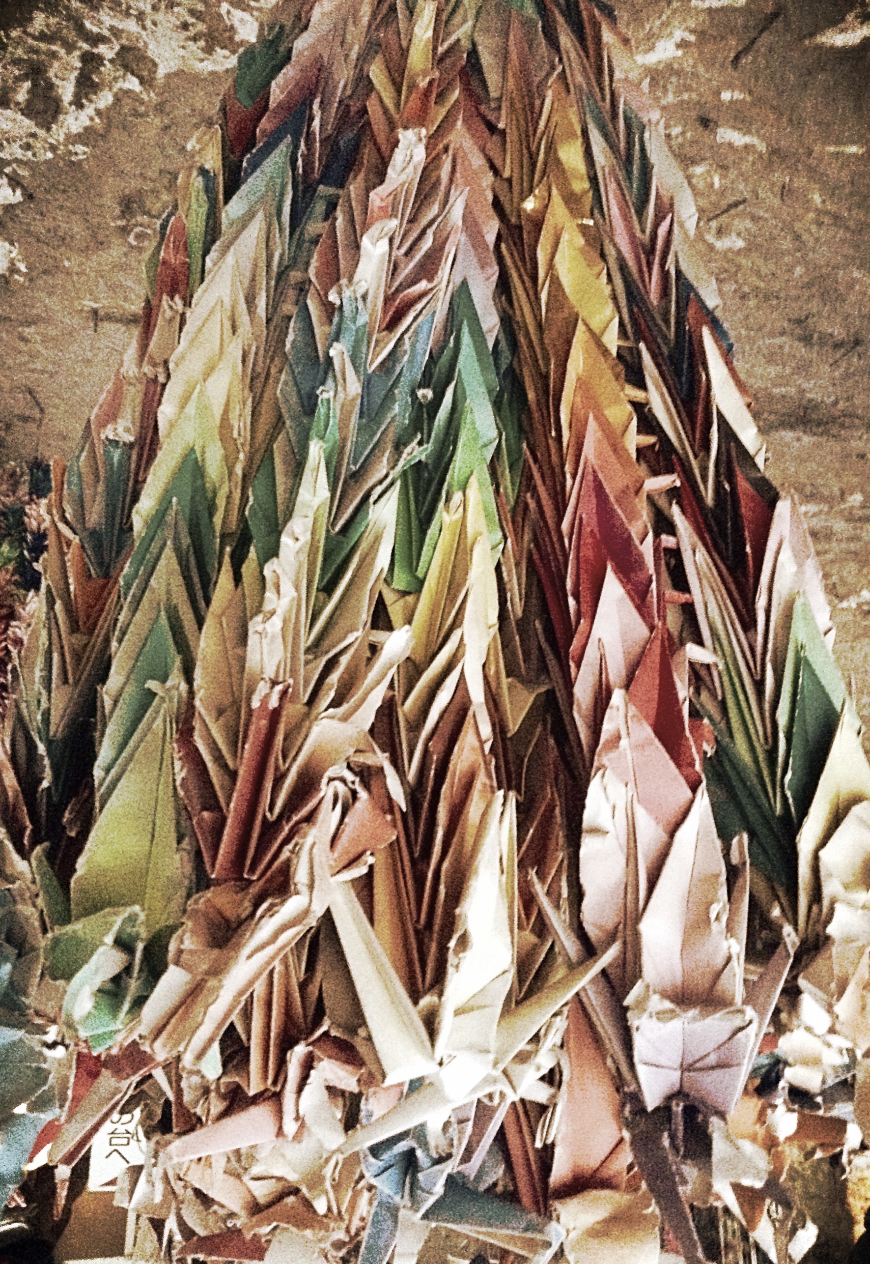 Cranes are folded and hung at temples and shrines as a wish for peace. They hang until they begin to fall apart and disintegrate, the colours fading into tatters.
