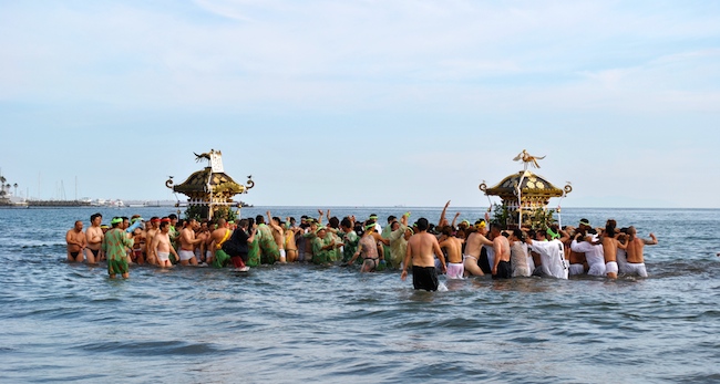 Two mikoshi (portable Shinto shrines/divine palanquins), supported by local men and women, locked in “battle” in the ocean just off the Zaimokuza area of Yuigahama Beach.