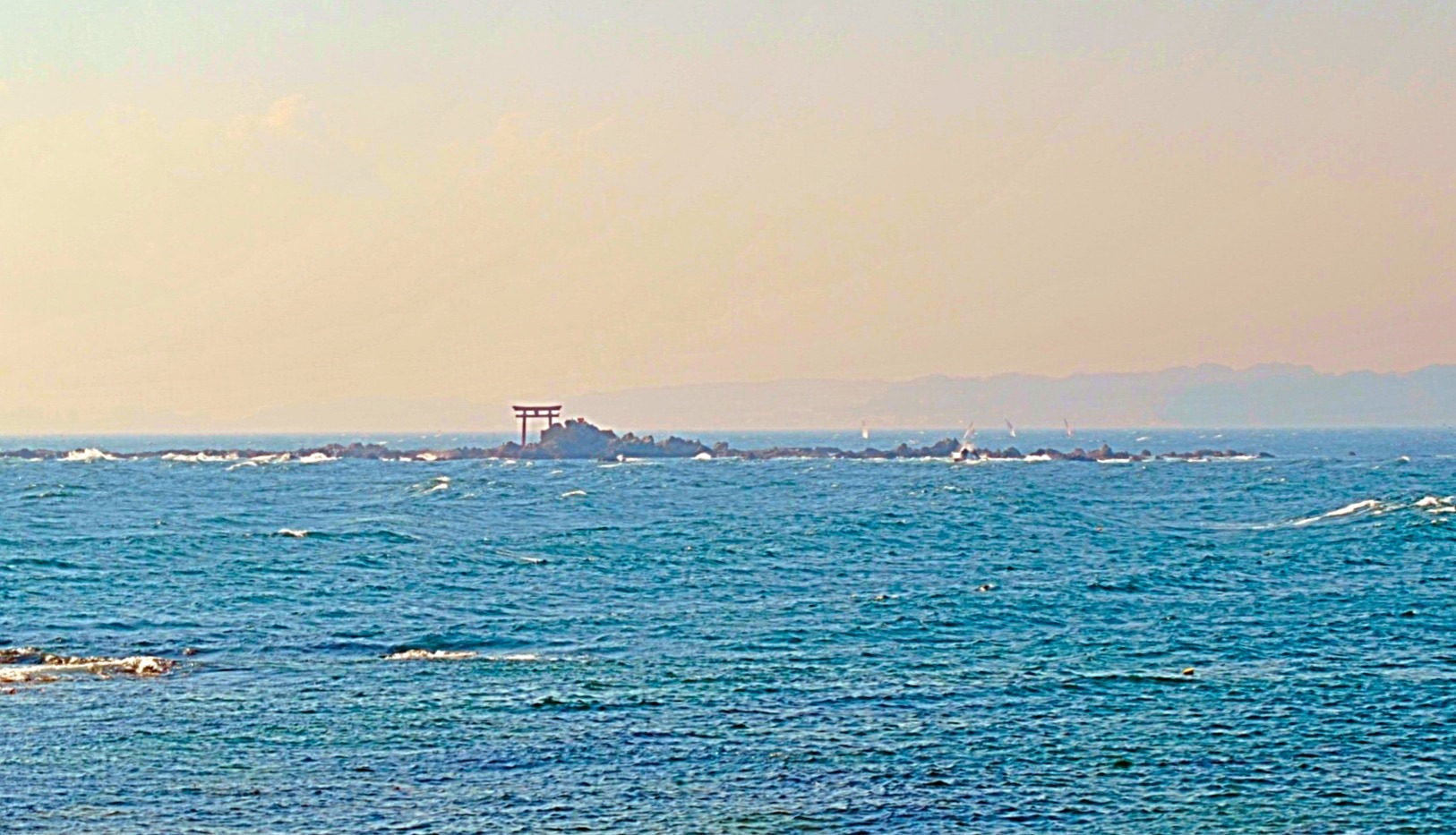We headed out that way the other day, and while we traced the seaside by way of winding roads, I saw a little torii gate out in the deep blue water. Hisashi told me it’s part of Morito Jinja, a local shrine.
