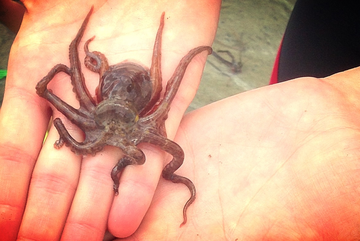 While playing on the beach with Kaede and friends the other day, he noticed a little something somersaulting across the sand. Closer inspection revealed it to be a wee octopus.
