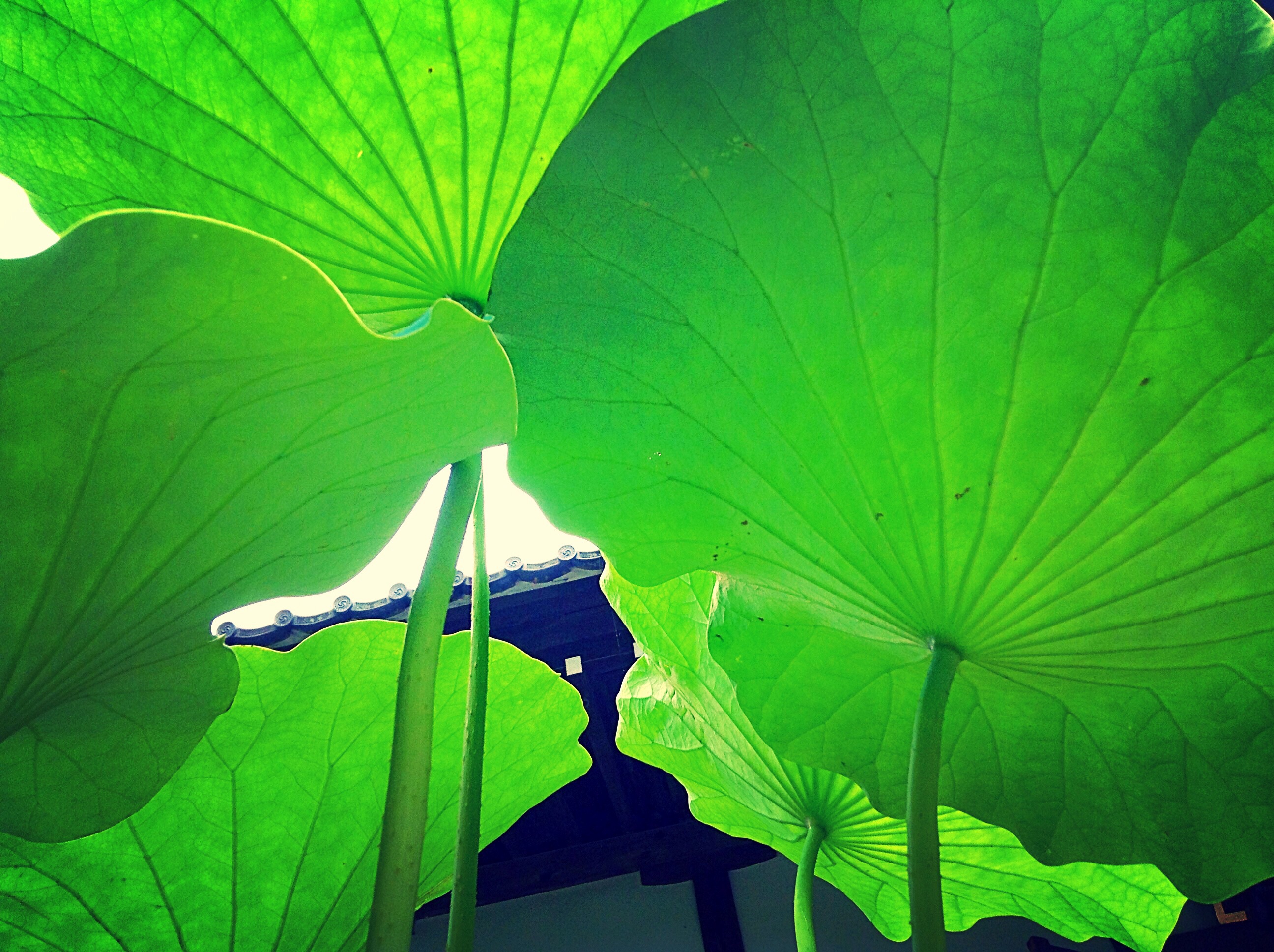 These lotus leaves are from a small plant at Kosoku-ji, a small temple next to Hasedera. Kosoku-ji has an impressive garden, but not too many lotus flowers. For a pond-full, head over to Hachimangu, where hundreds upon hundreds of blossoms stretch up towards the sky.