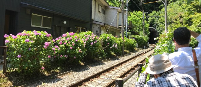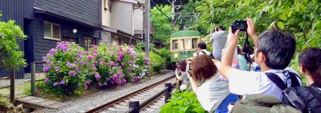 In Kamakura, June means hydrangeas. Thousands of them. And the tourists just eat it up. One of the most popular spots to take photos is Goryo Jinja, because the always-photogenic Enoden Line train rattles by as it exits the tunnel between Gokuraku-ji and Saka-no-shita.